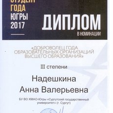 Одной из участниц стала и студентка 3 курса, направления «Юриспруденция» Института государства и права Надешкина Анна Валерьевна. По итогам конкурса она получила диплом в номинации «Студенческий лидер года образовательных организаций высшего образования». Перед ней стояла непростая задача, на протяжении двух дней прошла через 6 конкурсных испытаний: конкурс портфолио, самопрезентация, оксфордские дебаты, фестиваль креативных идей, шахматы Ришелье и заключительное слово участников соревнований.