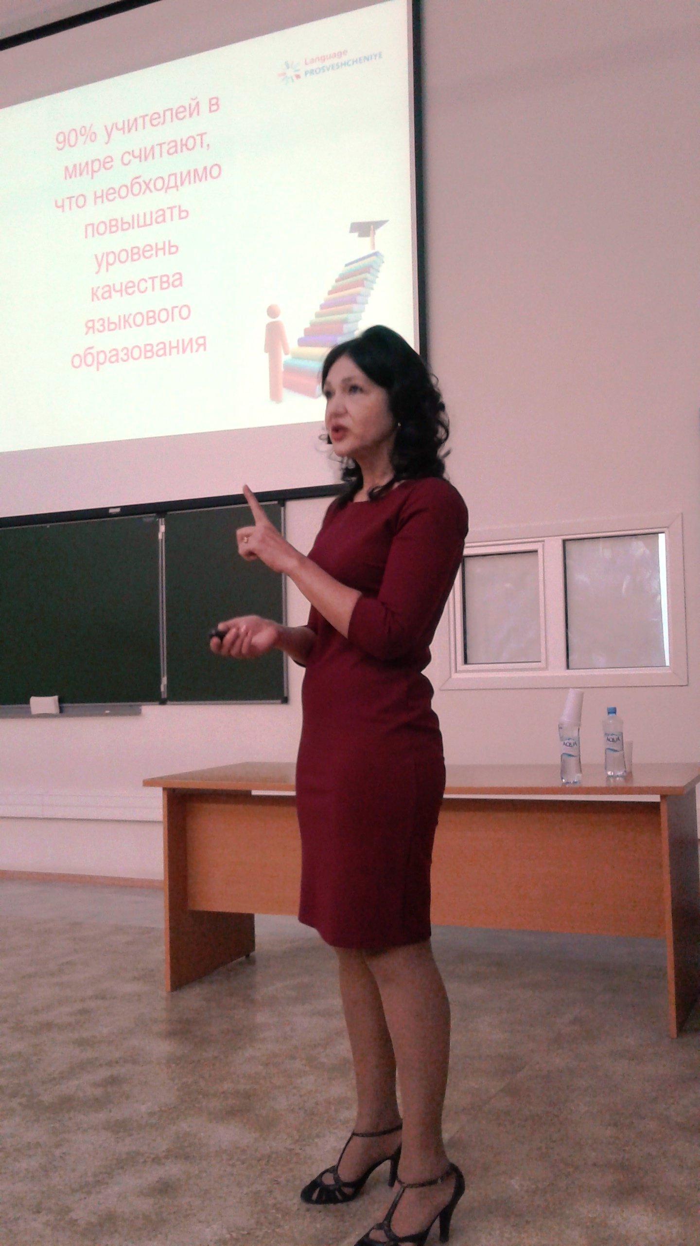 Заместитель генерального директора ООО «Лэнгвидж.Просвещение» кандидат исторических наук Анна Горизонтова познакомила учителей английского языка с современными тенденциями в преподавании английского языка для академических целей, новинками учебных пособий издательства «Pearson» («Пирсон»), культурологическим подходом к вопросам языка во всех его аспектах, а также методическим инструментарием международных языковых экзаменов.