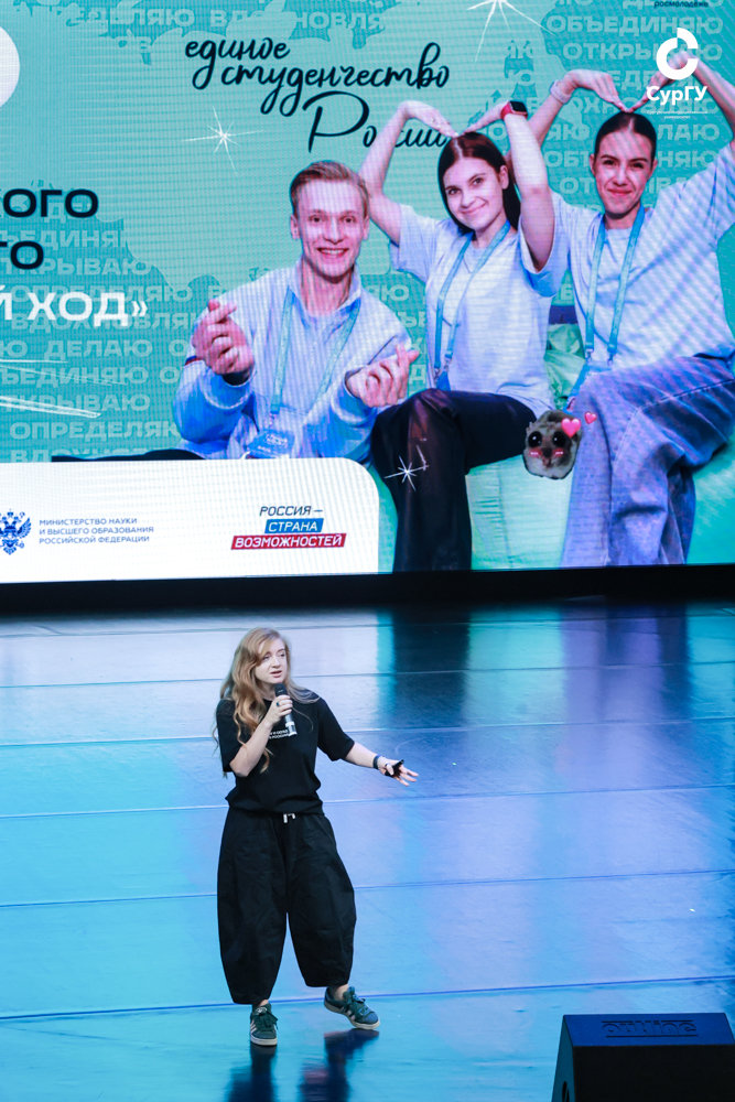 Обучающиеся СурГУ смогли узнать о том, что представляет собой этот масштабный проект и какие конкурсные треки он включает. В нем могут принять участие студенты высшего и среднего профессионального образования, которые готовы проявить себя как активную часть молодежного сообщества – реализовывать социально значимые программы в университетах, развивать творческие инициативы и создавать молодежные объединения в вузах. Обо всем этом на сцене Театра СурГУ рассказали эксперт проекта «Твой Ход» Юлия Терехова и координатор в университете Маргарита Семёнова. В фойе театра были оборудованы интерактивные площадки, проводился розыгрыш призов.