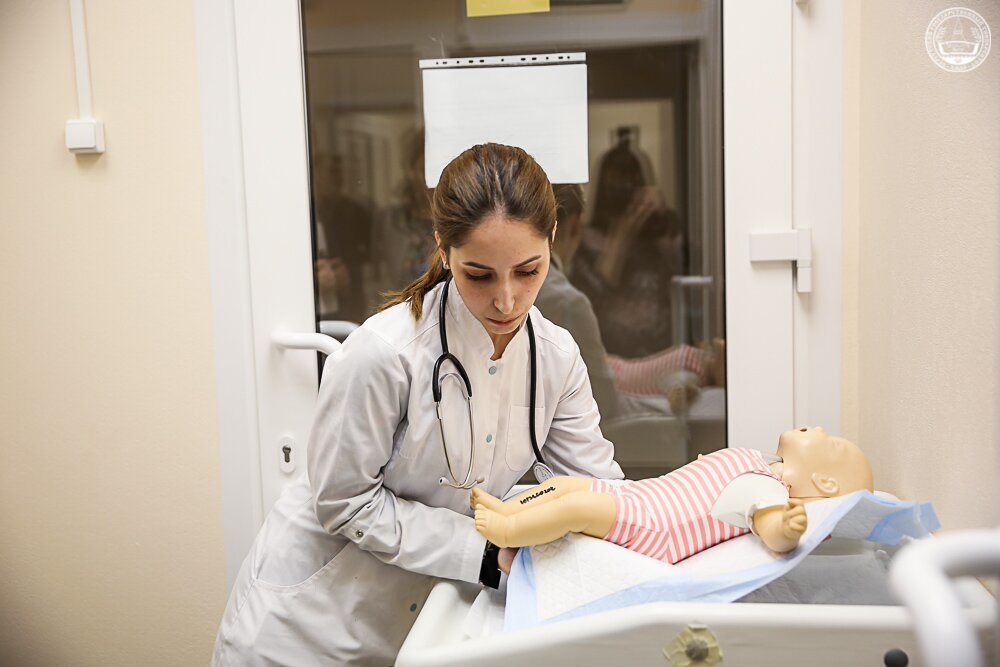 — «Мы с первого года обучения начали посещать симуляционный центр, где учились ухаживать за больными, осваивали навыки введения инъекций, клизм, катетеров. Здесь все максимально приближенно к реальности, благодаря роботам-симуляторам 6-го класса реалистичности, манекенам иностранного производства для отработки навыков обследования пациента с различными видами патологий, виртуальным тренажерам для проведения ультразвуковой диагностики, лапароскопических вмешательств и эндоскопических процедур. Сейчас будучи уже студентами 5-го курса, мы отрабатываем на манекенах сердечно-легочную реанимацию, проводим аускультацию, пальпацию, оказываем первую медицинскую помощь при экстренных состояниях. Словом, техническая оснащенность центра на очень высоком уровне» — поделилась впечатлениями студентка направления «лечебное дело» Фатима Омарова.