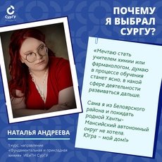 – В 10 классе думала над поступлением и в медицинский институт, но вовремя одумалась, все-таки прикладная химия мне ближе. Меня заинтересовали ключевые дисциплины, которые мы будем изучать на моей специальности, уже жду с нетерпением первых лекций и семинаров. Немаловажным при выборе вуза для меня оказались честные отзывы студентов о качестве образования, состоянии общежитий и отношении к вновь поступившим – все оказалось идеальным для меня, поэтому свой выбор остановила на Сургутском государственном университете. Надеюсь, эти пять лет студенческой жизни будут яркими и запоминающимися.