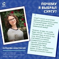 – СурГУ ничуть не уступает крупным региональным и даже столичный вузам, поэтому, на мой взгляд, я сделала правильный выбор! Конечно, не жду, что учеба будет легкой – это большой, тяжелый труд, но мне он под силу. Хотела бы активно участвовать и в жизни университета: различных научных, культурных мероприятиях, ведь студенчество – незабываемое время, которое должно навсегда остаться в памяти, – с надеждой говорит Анастасия Купцова, будущий химик-лаборант, аналитик, а может, главный технолог какой-нибудь нефтяной компании, время, как говорится, покажет.