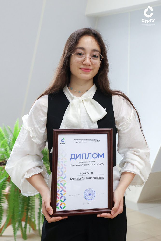 По итогам конкурсных испытаний звание «Лучшего выпускника СурГУ» завоевала студентка направления «лингвистика» Института гуманитарного образовании и спорта Карина Кунягина.