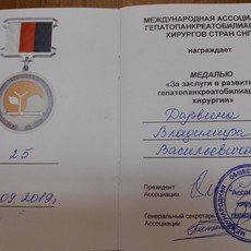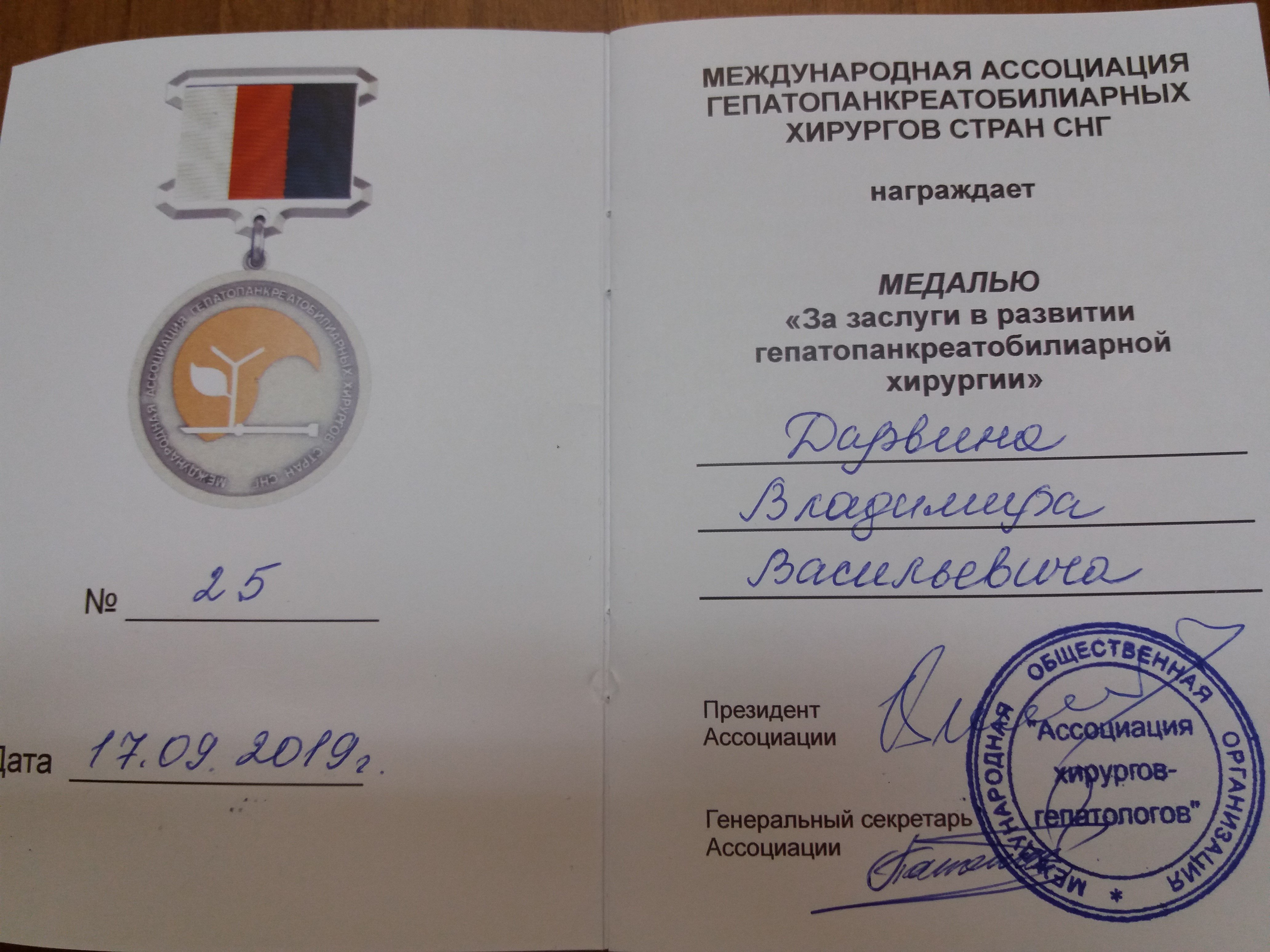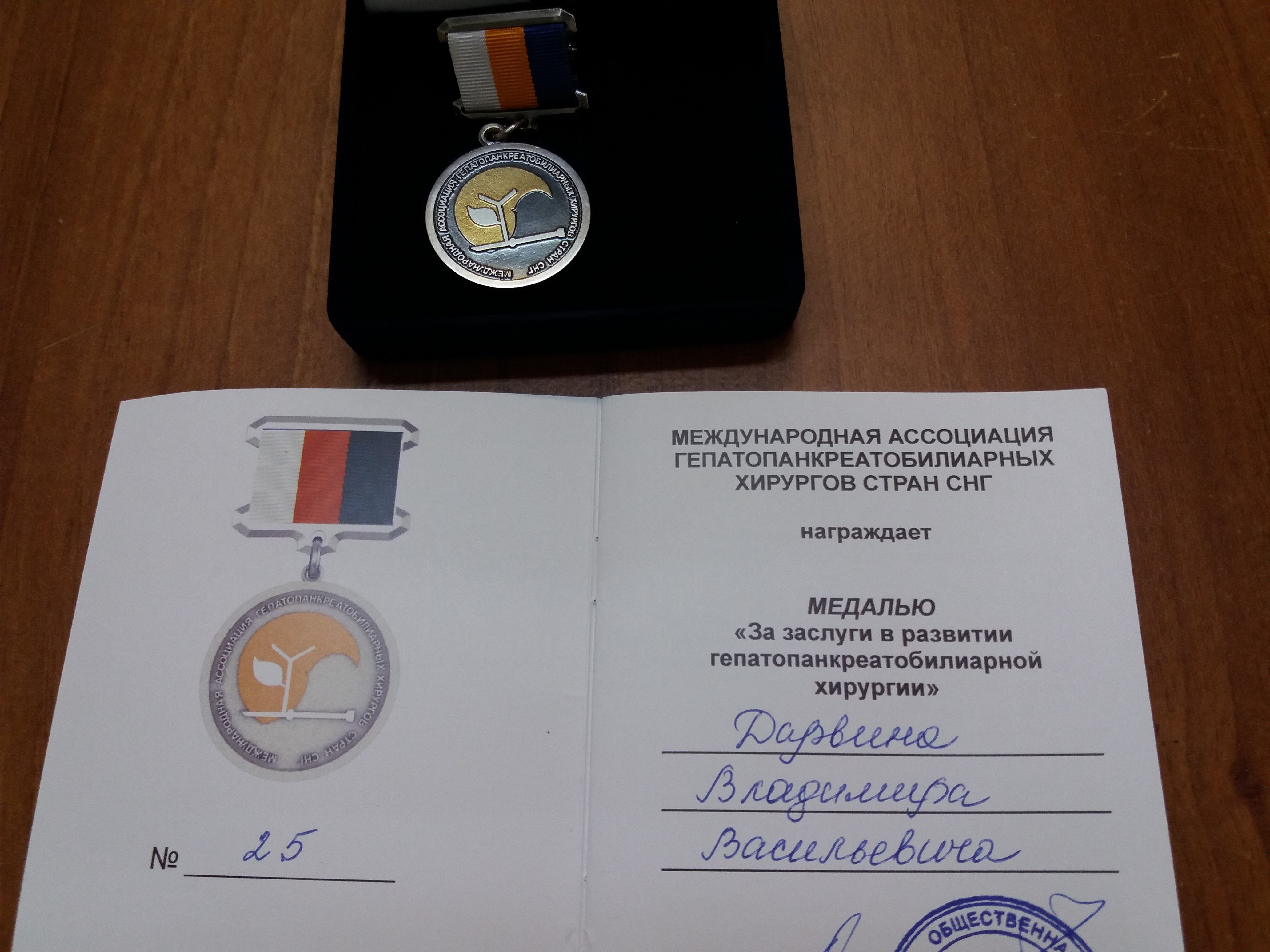 17 сентября 2019 года международной Ассоциацией гепатопанкреатобилиарных хирургов стран СНГ прошло награждение медалью «За заслуги в развитии гепатопанкреатобилиарной хирургии» заведующего кафедрой хирургических болезней, д.м.н., профессора Дарвина Владимира Васильевича. Владимир Васильевич – двадцать пятый хирург стран СНГ, имеющий подобную награду. Кафедра хирургических болезней сердечно поздравляет своего руководителя с наградой и желает крепкого здоровья и дальнейших творческих успехов!