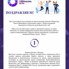 Первый конкурс для физических лиц на предоставление грантов губернатора Югры на развитие гражданского общества. Среди физических лиц конкурс проводится по 13 направлениям – наука и просвещение; поддержка детских и молодежных проектов; культура и искусство; охрана здоровья; креативная деятельность; поддержка институтов гражданского общества; социальное обслуживание, социальная поддержка и защита отдельных категорий граждан, поддержка коренных малочисленных народов Севера и др. Размер гранта составляет не более 250 тысяч рублей. Срок реализации проекта – не более 12 месяцев с момента заключения соглашения.