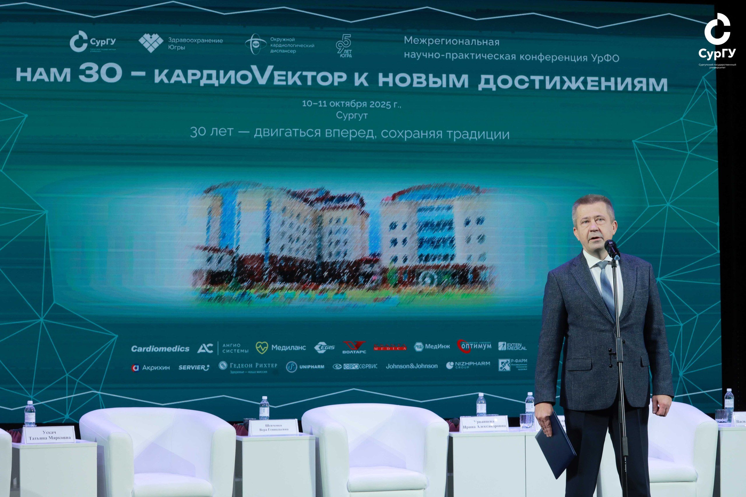 На торжественном открытии гостей и участников приветствовали глава города Сургута Максим Слепов, начальник отдела организации специализированной, в том числе высокотехнологичной медицинской помощи департамента здравоохранения Югры Вера Шевченко и первый проректор СурГУ Иван Даниленко. Иван Николаевич поздравил коллектив Окружного центра диагностики и сердечно-сосудистой хирургии с 30-летним юбилеем от имени ректора СурГУ Сергея Косенка: