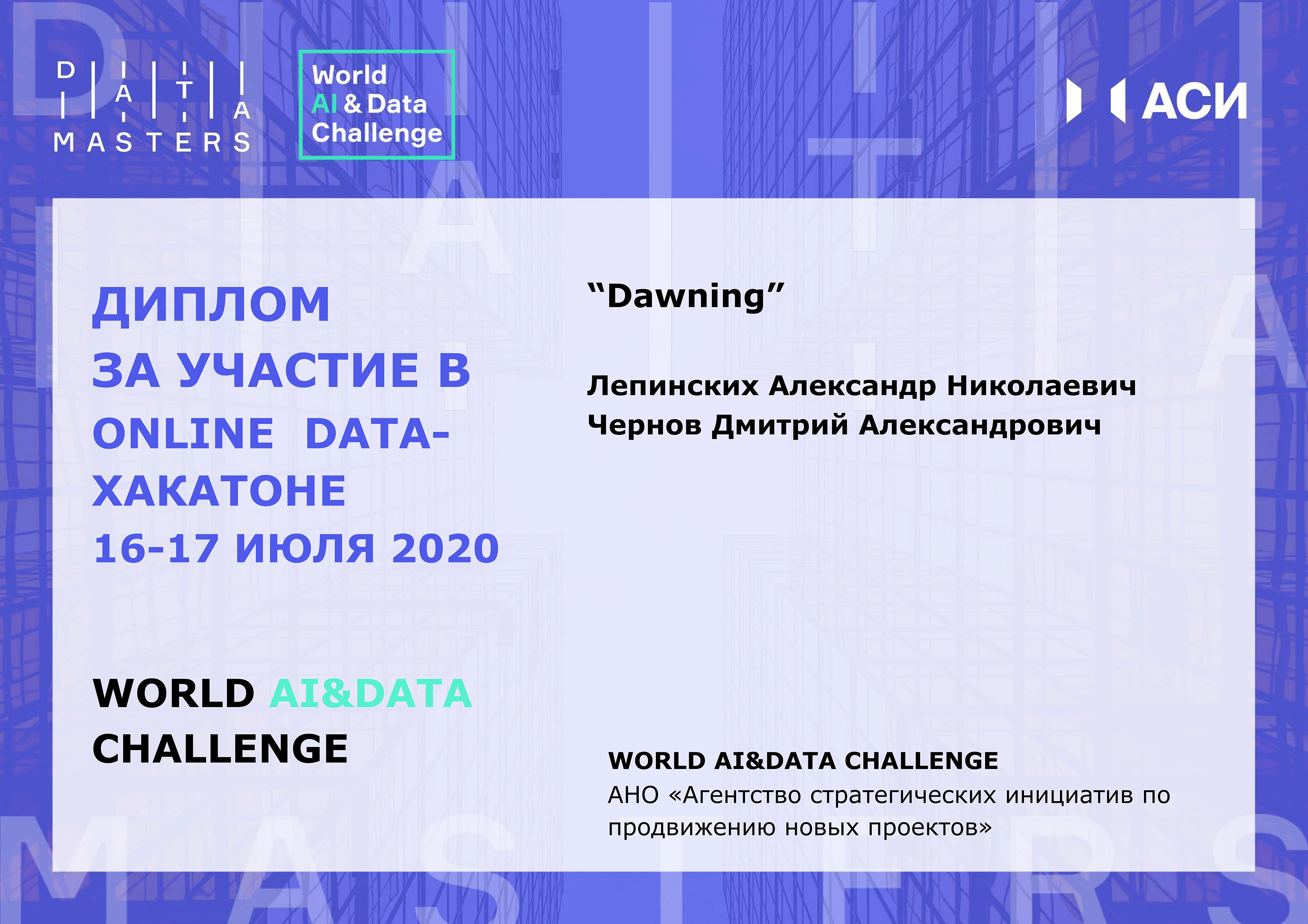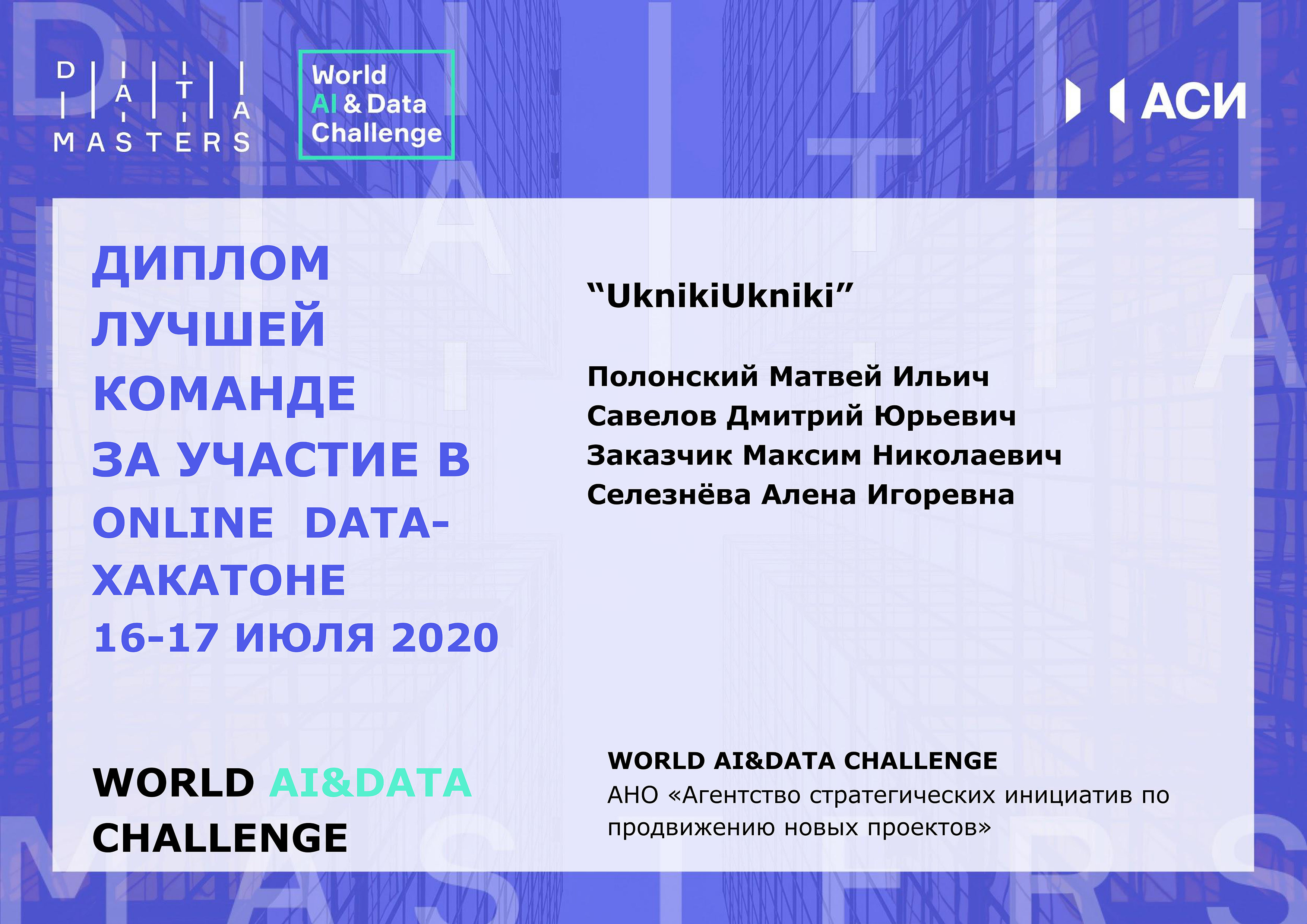 По итогам 48-часового онлайн-интенсива Агентство стратегических инициатив по продвижению новых проектов наградило дипломом за участие команды к Dawning и Legio Cybernetica. И сразу три команды СурГУ, оставившие свой цифровой след, – BigDuck, Team, UknikiUkniki признаны сообществом экспертов лучшими!