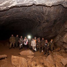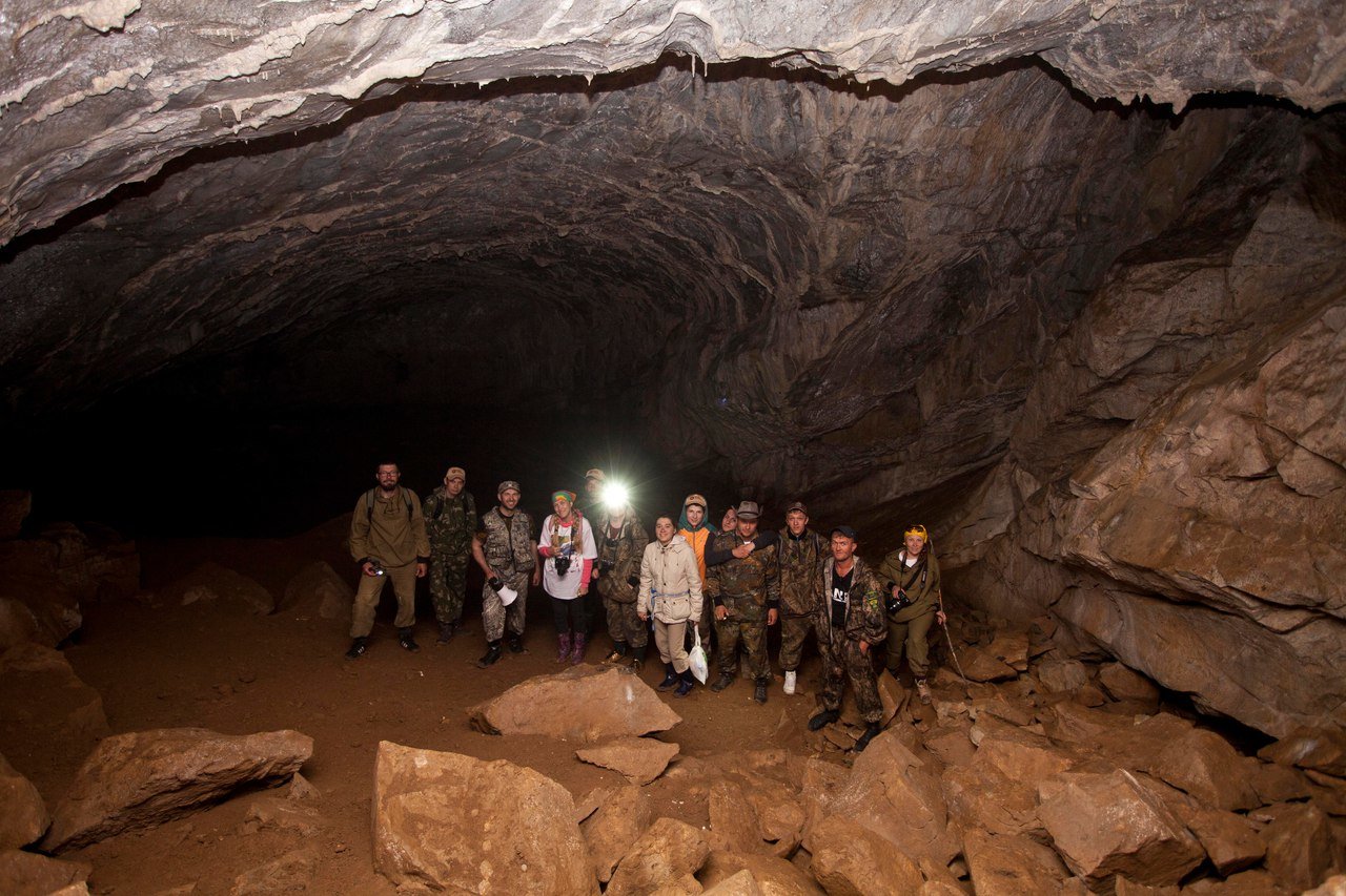 Пещера была относительно глубокая и высокая. В ней видели спящих летучих мышей — маленькие комочки на стене.