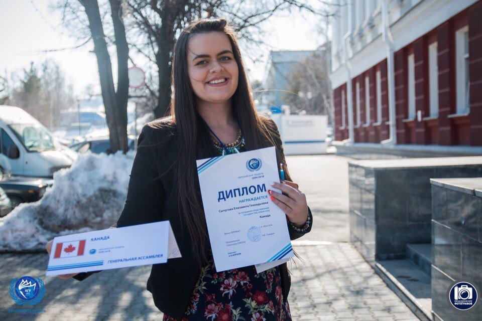 На Евразийской модели ООН, проходившей в Алтайском государственном университете (г. Барнаул), я выиграла грантовый конкурс, получила грант и работала в комитете ГА ООН по повестке дня «Проблемы социального неравенства и социальной несправедливости», представляла интересы страны Канады, также был комитет ЮНЕСКО ООН. На торжественном открытии модели мы провели флешмоб «#АутизмНеПроблема», посвященный Всемирному дню распространения информации о проблеме аутизма, установленный резолюцией ООН. С приветственной речью выступил ректор АГУ Сергей Земляков. СМИ CNN, BBS, Russia Today освещали также культурную программу: экскурсии по главным достопримечательностям Барнаула, музею «Горная аптека», Клуб настольных и интеллектуальных игр «Фокс», лекции с гостями конференции, встречи с общественными деятелями, посещение спектакля «Темные аллеи» Алтайского краевого театра драмы им. В. М. Шукшина, неформальные встречи, общее фотографирование.