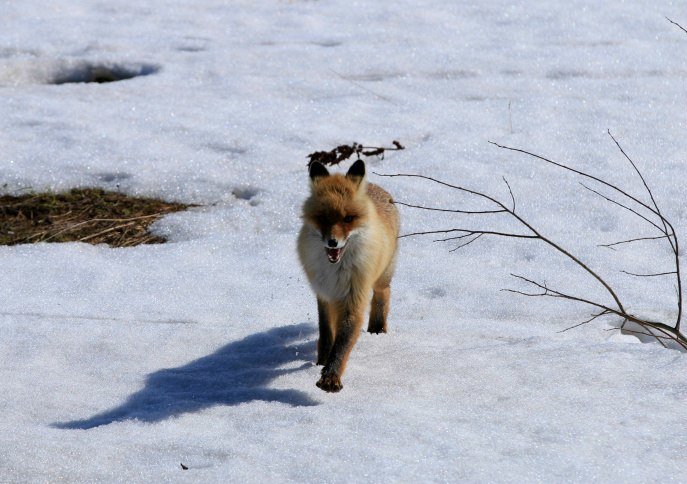 «…12-й день. 16.04. Весь день провели в дороге. Из приятного: встреча с дикими животными: у обочины мышковала лисица (ныряла в снег за мышами — прим. авт.). Не знаю, чем ее привлекли наши фотографы, но она побежала в их сторону и прошлась буквально в метре от них. Удалось сделать хорошие кадры.