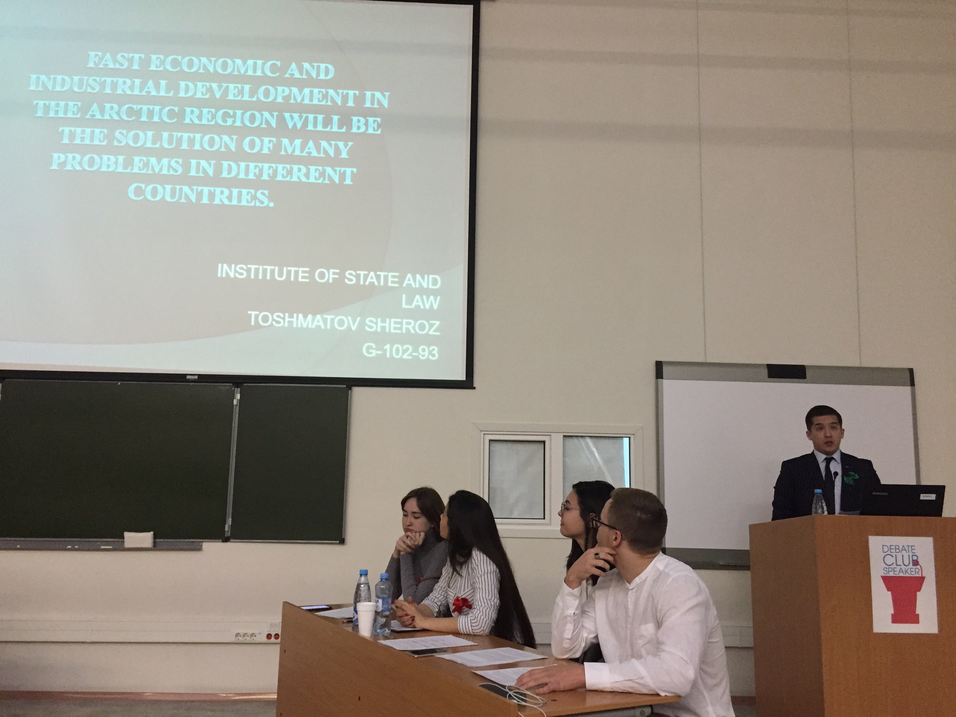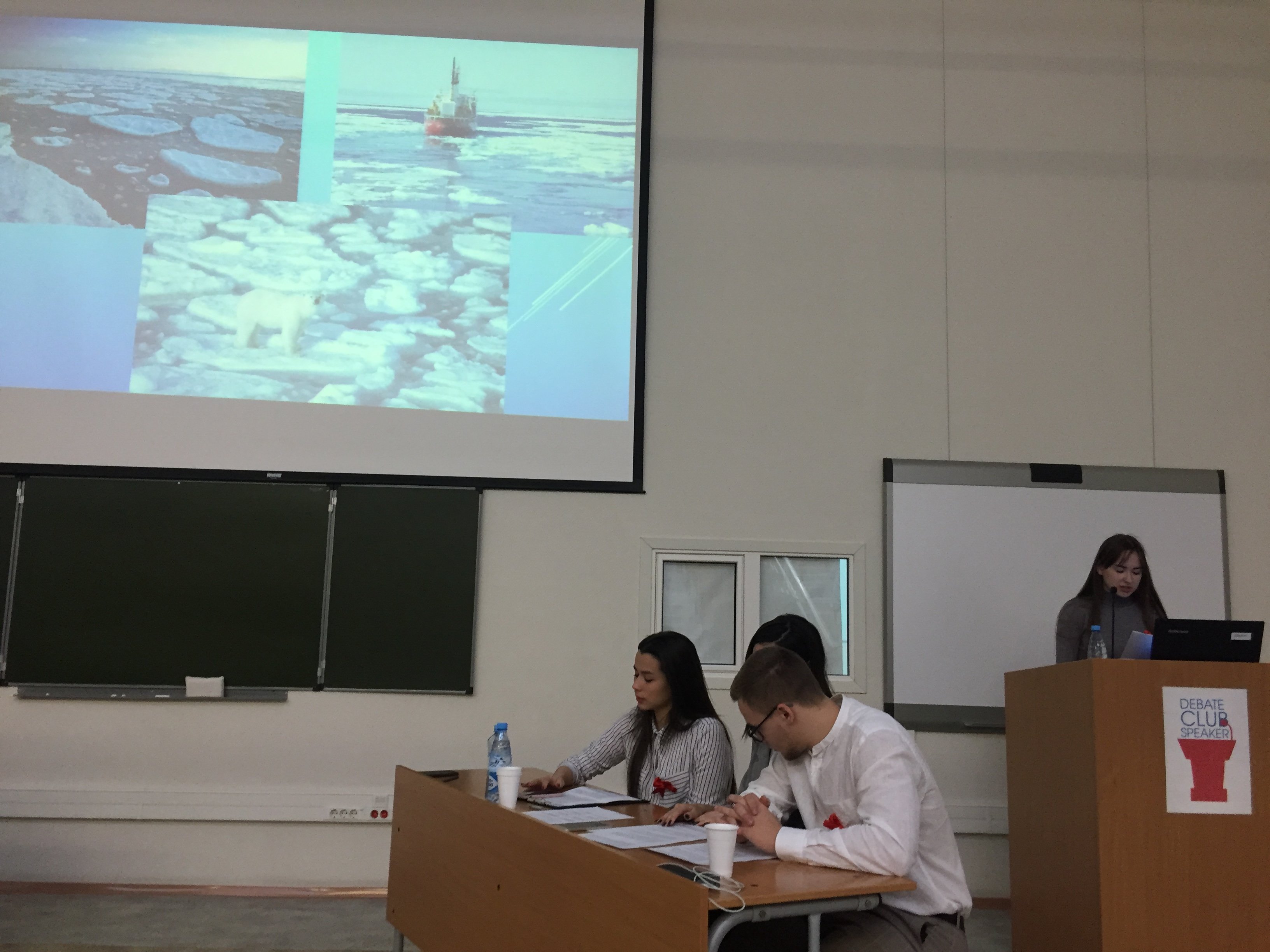 Тема заседания – обсуждение проблем, связанных с Арктическим регионом. Для двух команд спикеров были выдвинуты следующие тезисы: геополитическая ситуация в арктическом регионе, экологические и экономические проблемы. Дебаты проводились в устной форме и демонстрацией презентаций на английском языке. Участники дебатов – студенты 1-го и 2-го курсов различных институтов СурГУ (ИГОиС, ИГиП, ИЭиУ и ИЕиТН).