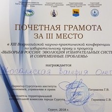 Напомним, XIII научно-практическая конференция проходила на базе Сургутского института экономики, управления и права в октябре прошлого года. Студентка СурГУ Валерия Жогальская, чья фотография уже второй семестр подряд опубликована на Доске Почета, выступала в секции: «Современные проблемы избирательного права и процесса», где заняла третье место. И останавливаться на достигнутом третьекурсница не собирается: «Впереди еще много научных трудов, а значит предстоит большая и кропотливая работа!»