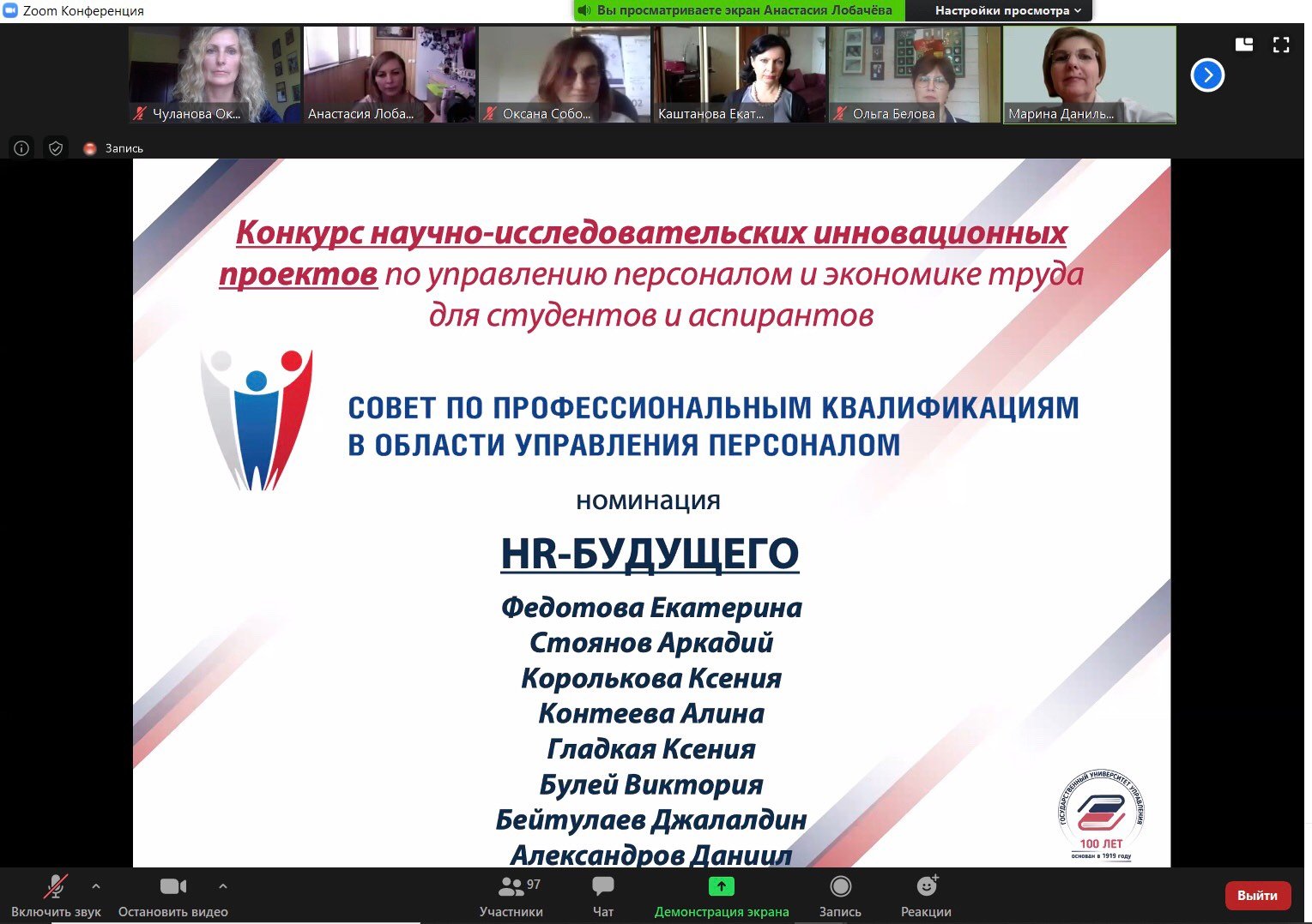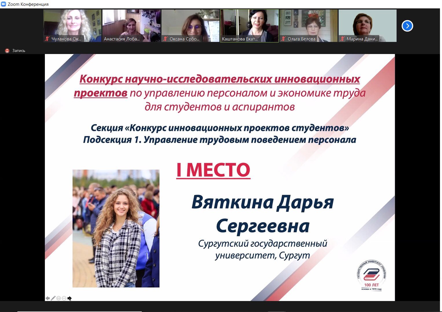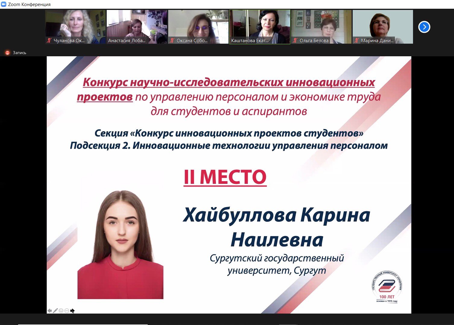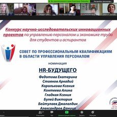 По итогам финальной защиты проектов 13 мая в режиме видеоконференции на площадке Zoom с организацией трансляции на платформе Twitch диплома 1-й степени за первое место в Конкурсе научно-исследовательских инновационных проектов по управлению персоналом и экономике труда для студентов и аспирантов в секции «Управление трудовым поведением персонала» удостоена Дарья Вяткина. Диплом 2-й степени за второе место в секции «Инновационные технологии управления персоналом» у Карины Хайбулловой. В этой же секции диплом 3-й степени за третье место у Оксаны Свиридовой.