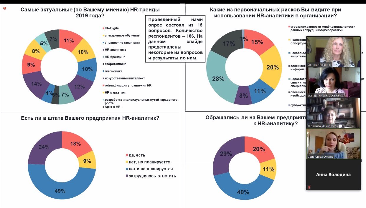 Онлайн-конференция «Путь к успеху», открытый круглый стол «Найти и отобрать. Новые идеи в оценке кандидатов», а также просмотры работ финалистов Конкурса научно-исследовательских инновационных проектов и Студенческой олимпиады «Управление персоналом: вчера, сегодня, завтра» были проведены 13–15 мая в режиме видеоконференции на площадке Zoom с организацией трансляции на платформе Twitch. Ежедневно в онлайн-мероприятиях принимало участие от 70 до 230 человек.