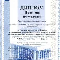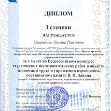 Победителем Всероссийского конкурса в секции «Управление персоналом: перспективы и развитие в условиях цифровой экономики» стала Оксана Свиридова. Студентка СурГУ представила свои исследования по проектированию внедрения системы HR-аналитики как технологии оптимизации процессов управления персоналом». Второе место заняла Карина Хайбуллова за исследовательскую работу в области разработки инструментария внедрения технологии искусственного интеллекта в управление персоналом в цифровой парадигме. Научным руководителем победительниц также является Оксана Леонидовна.