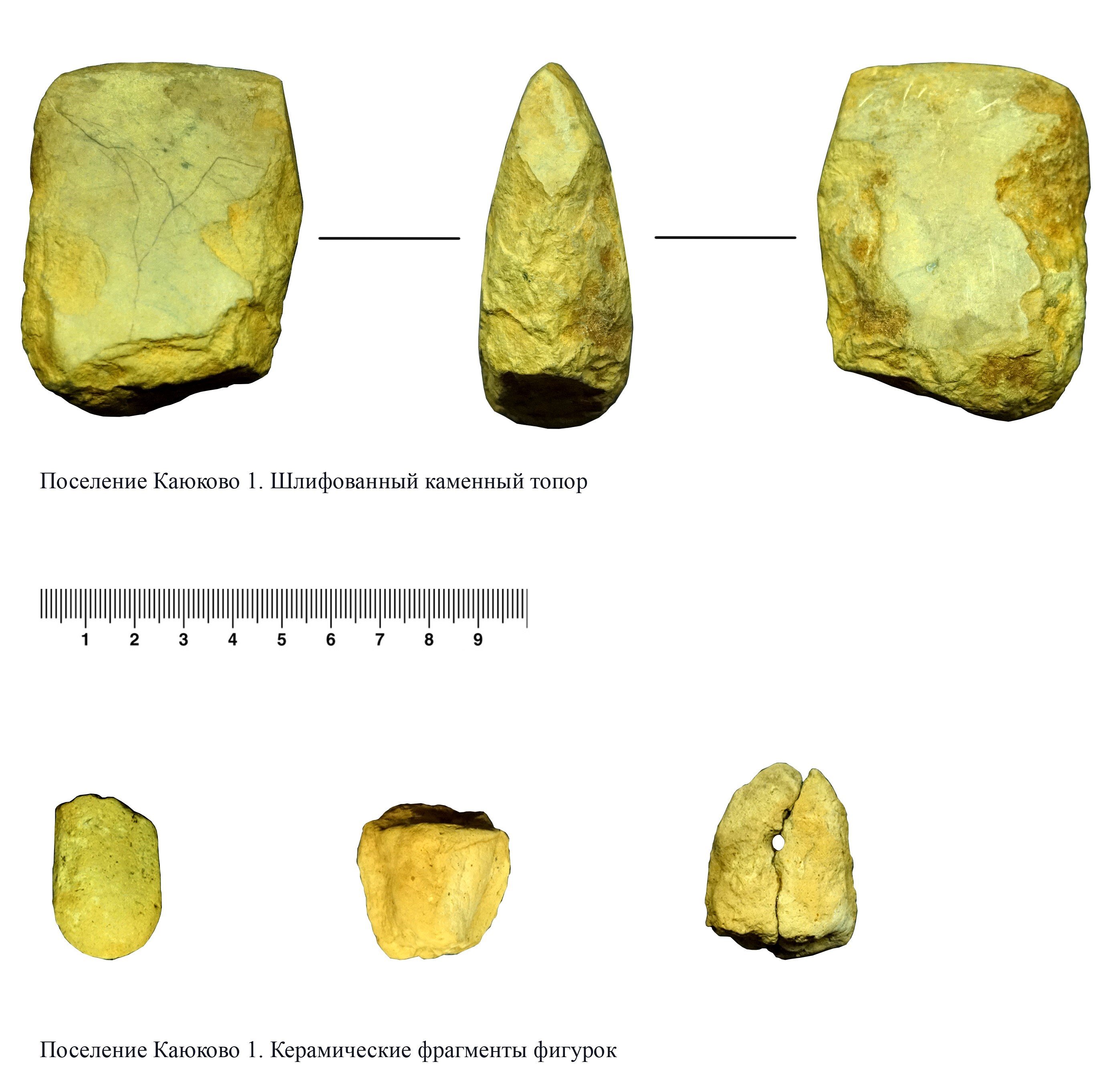 Большая часть из них – каменные орудия и фрагменты керамической посуды. Из наиболее интересных – шлифованный каменный топор и три фрагмента керамических фигурок. Есть предположение, что это головки птичек. Трудно определить, относятся ли они к категории сакральных или же это просто бытовая игрушка. Датировку артефактов ученые смогут провести после лабораторного анализа, пока можно предположить, что возраст находок соответствует возрасту памятника.