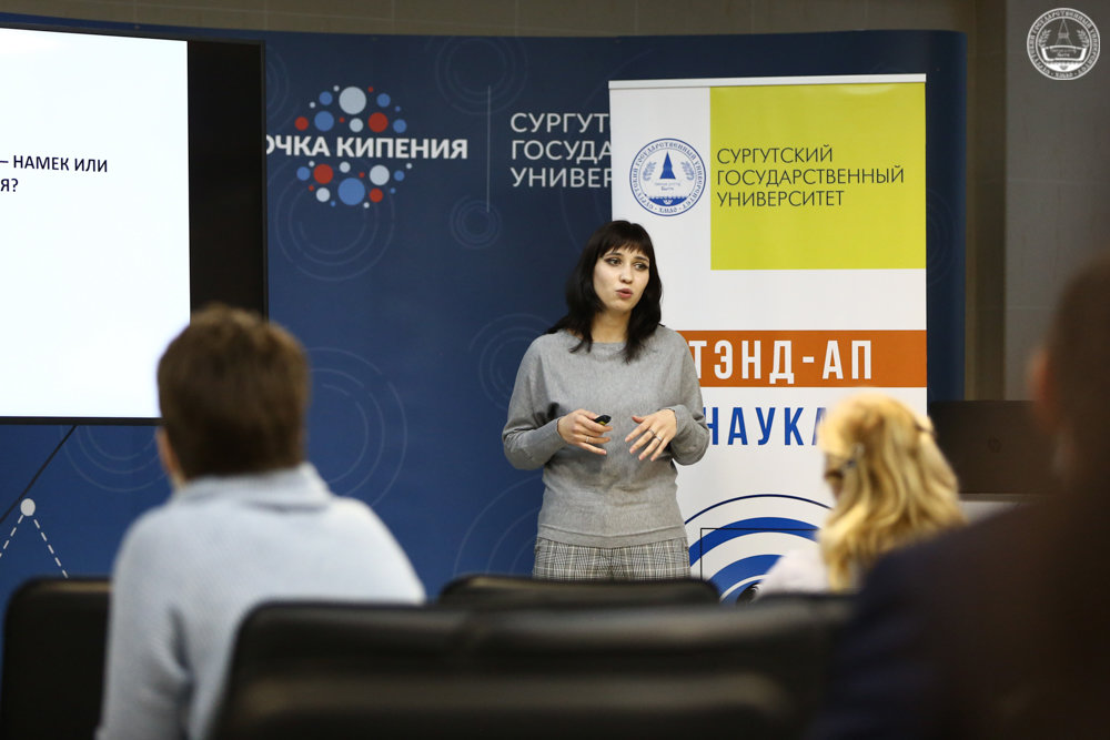 Научно-популярное шоу своим выступлением открыла аспирант СурГУ, преподаватель кафедры иностранных языков Потоцкая Надежда. Тема доклада весьма актуальная : «Прецедент в рекламе: тонкий намек на толстое обстоятельство». Каждый из зрителей узнал свою ленту в социальной сети.