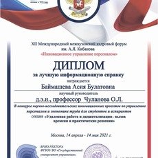 Дипломом «Лучший инновационный проект» награждена Асия Баймашева за научно-исследовательский проект «Применение HR-аналитики для оптимизации процессов работы с персоналом и кластеризации функционала HR-аналитика на основе K-MEANS». За инновационный проект «Модель интеграции концепции «экологичного офиса» как составляющей технологии WELL-BEING в работу с персоналом» дипломом первой степени в секции «Эффективное использование и инновационные технологии управления персоналом» награждена Анна Рябова.