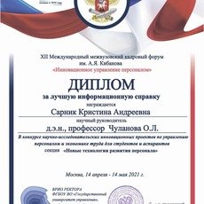 В секции «Новые технологии развития персонала» третье место у Марии Данькиной за исследование «GAME&TRAINING» и интеграция его в обучение персонала организации». Кристина Сарник награждена дипломом «Лучшая информационная справка» за проект «Разработка инструментария обучения персонала организации с применением технологий VR в условиях удаленной работы».