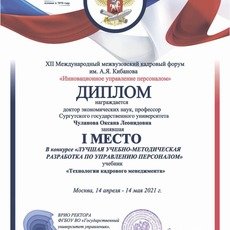По результатам экспертной оценки в конкурсе «Лучшая учебно-методическая разработка по управлению персоналом» дипломом первой степени отмечен труд Оксаны Чулановой – «Технологии кадрового менеджмента».
