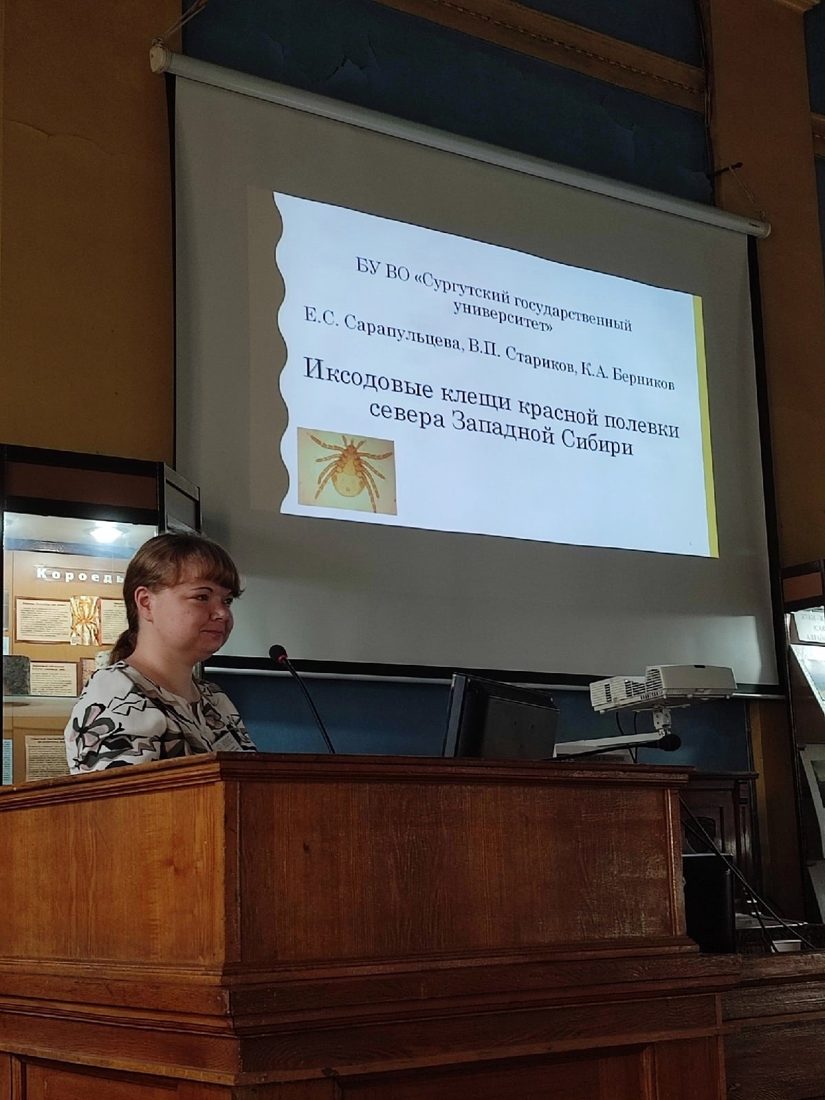 Промежуточные результаты исследования Екатерина Сарапульцева представила на XVI съезде Русского энтомологического общества в МГУ им. М. В. Ломоносова, а также на VII Межрегиональной конференции «Паразитологические исследования Сибири и Дальнего Востока» в Институте систематики и экологии животных СО РАН в Новосибирске. Ее доклад «Иксодовые клещи мелких млекопитающих на северной периферии ареала в Западной Сибири» вызвал неподдельный интерес у научного сообщества, которые отметили внушительный объем собранного материала и выразив свое желание к сотрудничеству.