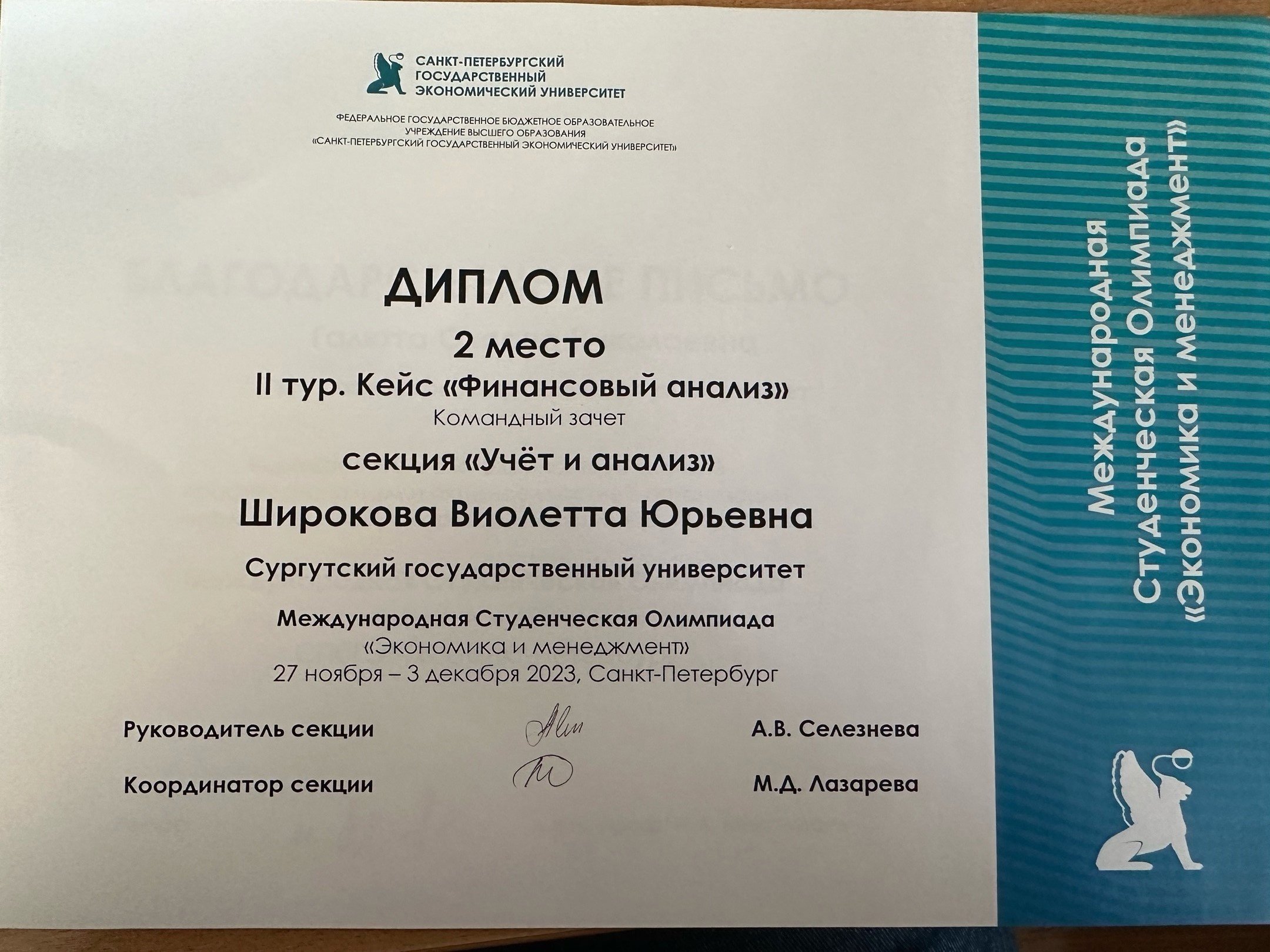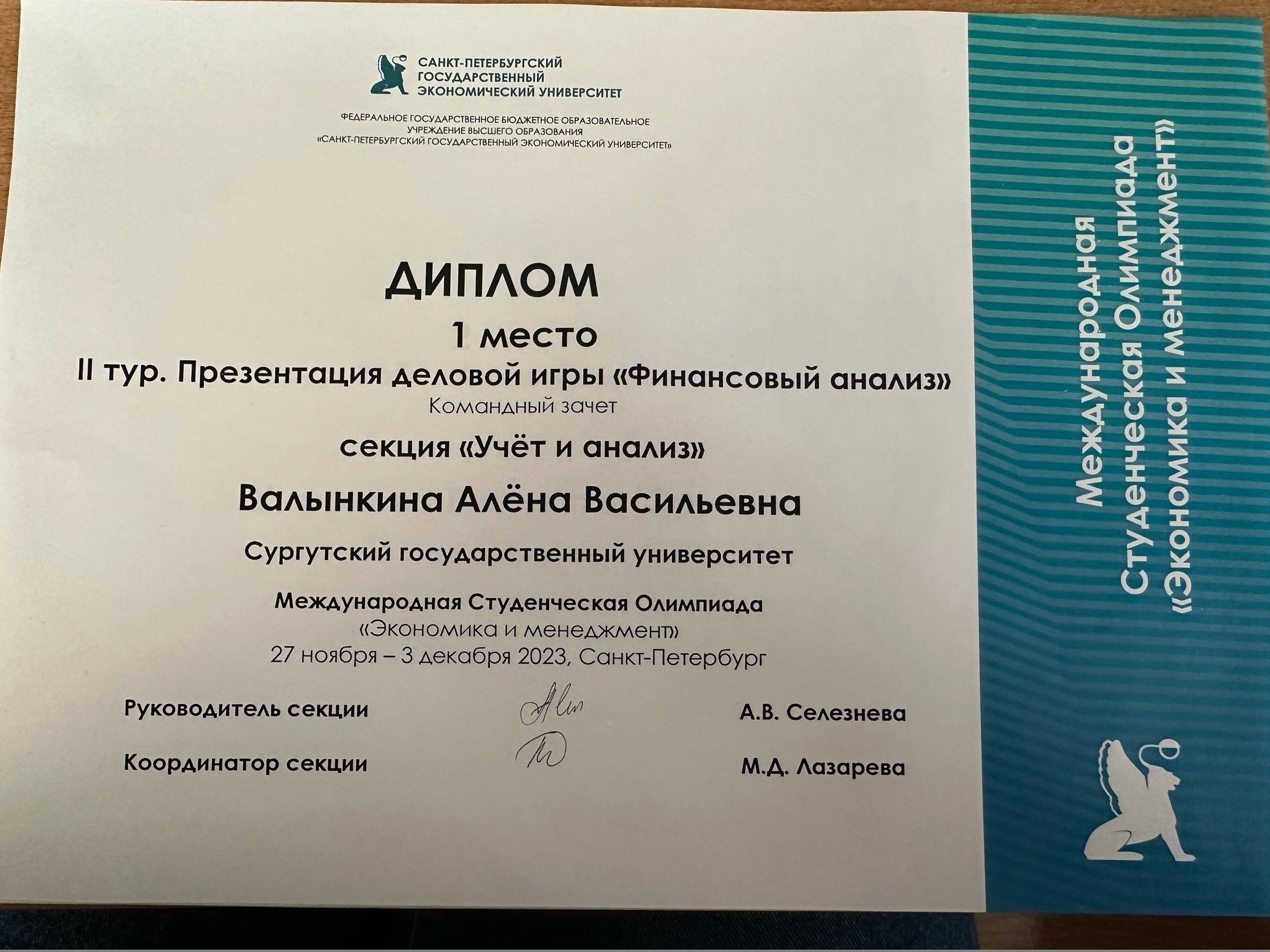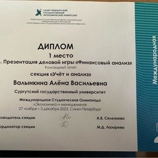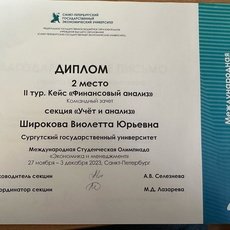 Во втором туре «Презентация деловой игры "Финансовый анализ"» секции «Учет и анализ» 1-е место заняла студентка 3-го курса направления «экономика» Алена Валынкина. В этой же секции в кейсе «Финансовый анализ» 2-е место у ее одногруппницы Виолетты Широковой.