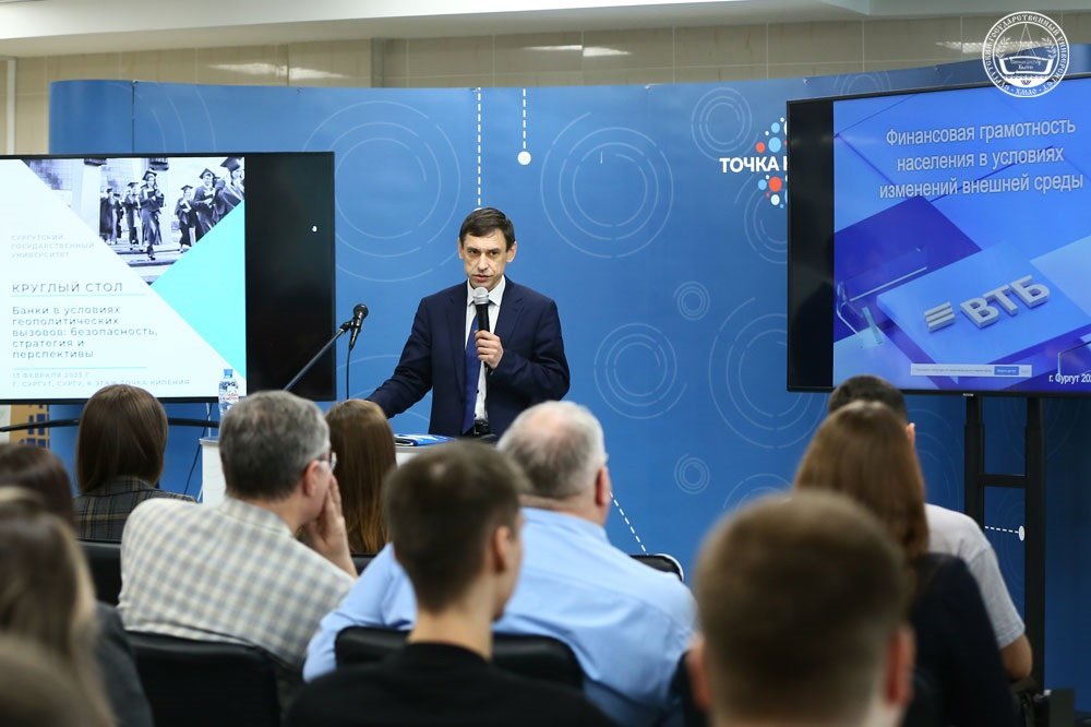 Не менее интересным и в то же время очень содержательным был доклад «Финансовая грамотность населения в условиях изменений внешней среды» управляющего ВТБ в Ханты-Мансийском автономном округе – Югре Владимира Шевелева. Со студенческой аудиторией Владимир Сергеевич говорил про эволюцию денег, инвестирование, активный и пассивный доход, сколько денег нужно для счастья и, конечно, о роли финансовой грамотности населения. По словам эксперта, сегодня без знания основ финансовой грамотности мудро распоряжаться личными денежными средствами не получится: «У каждого человека есть право выбора, куда вложить свои деньги и от этого решения зависит его будущее. Кризис – это возможности. Важно, чтобы деньги всегда работали и приносили определенные результаты».