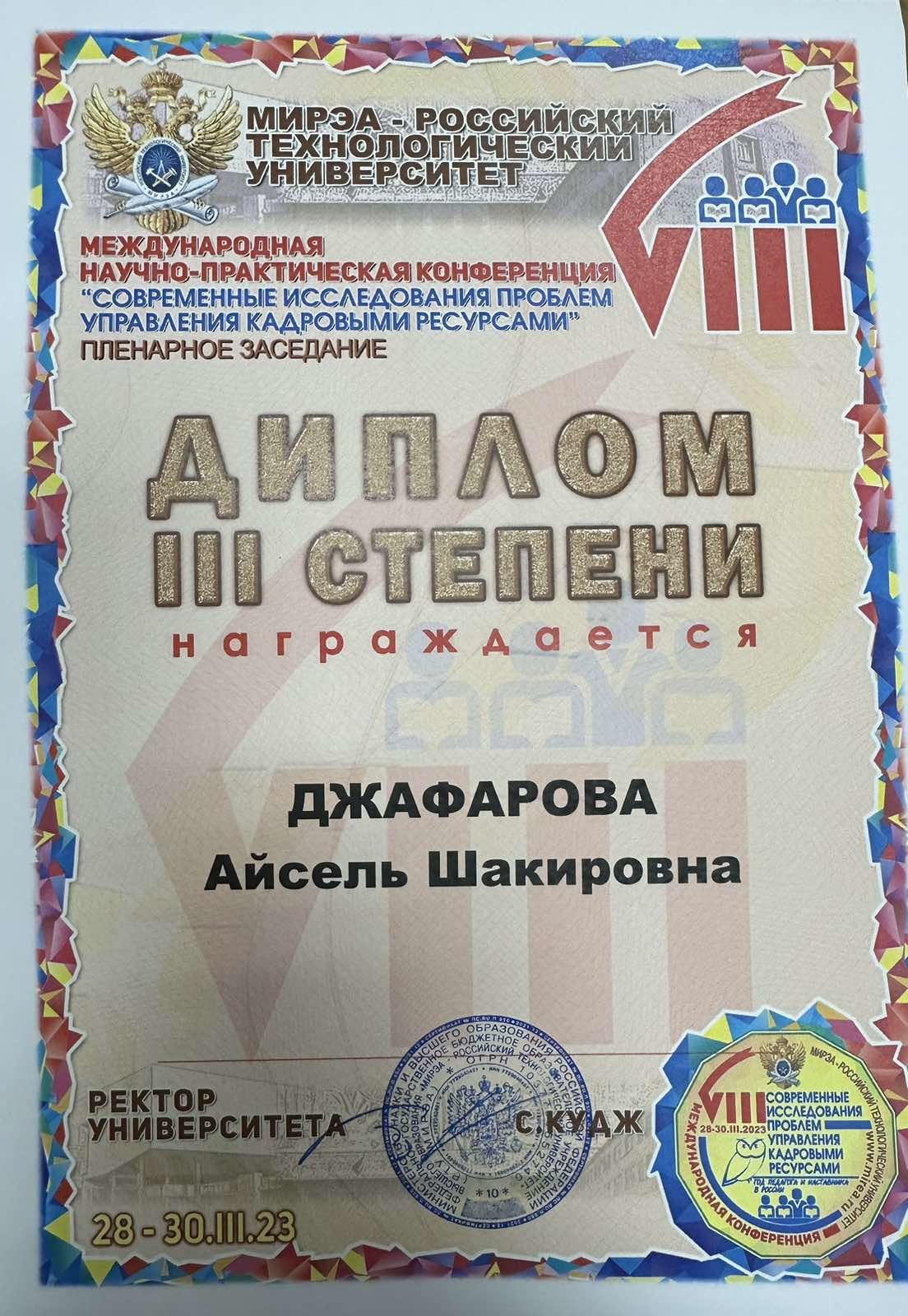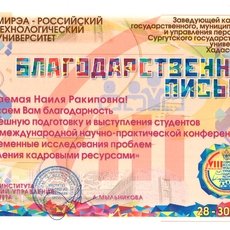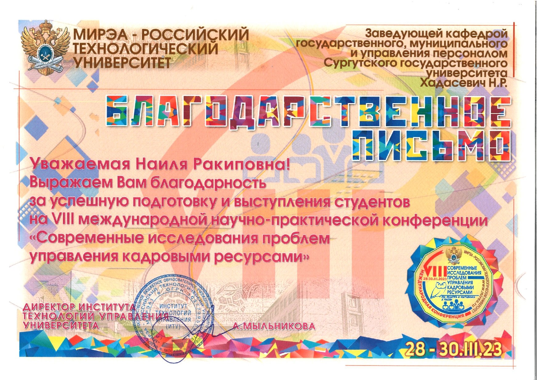 Научно-практические исследования представителей СурГУ получили высокую оценку. Трое студентов участвовали в конференции очно, подготовила их и сопровождала старший преподаватель кафедры государственного и муниципального управления и управления персоналом Анна Михайловна Задимидченко. В пленарном заседании дипломом III степени награждена Джафарова Айсель Шакировна (руководитель А. М. Задимидченко), в секции «Актуальные вопросы формирования персонала современных организаций» дипломом I степени – Валеева Эльвира Рашитовна (руководитель А. М. Задимидченко) и дипломом III степени – Чобанян Мелс Григорьевич (руководитель О. Л. Чуланова). В секции «Актуальные вопросы развития персонала современных организаций» дипломом II степени удостоена Крючкова Ольга Константиновна (руководитель Н. Ю. Кауфман), в секции «Современные исследования проблем государственного и муниципального управления» дипломом II степени – Сенькин Виктор Андреевич (руководитель А. М. Задимидченко), дипломом III степени – Слинкина Виктория Сергеевна (руководитель В. А. Кручинина). Высокая практическая значимость и актуальность исследования отмечена в работах Антипиной Анны Александровны и Фильчак Александры Андреевны, Цецхладзе Дианы Эмзариевны, Шарифханова Динара Дамировича, Адмиральской Алины Евгеньевны. Всего в конференции поучаствовали более 20 студентов и магистрантов кафедры, некоторые направили свои статьи для публикации в сборнике конференции.
