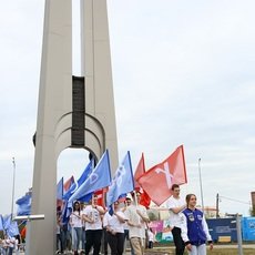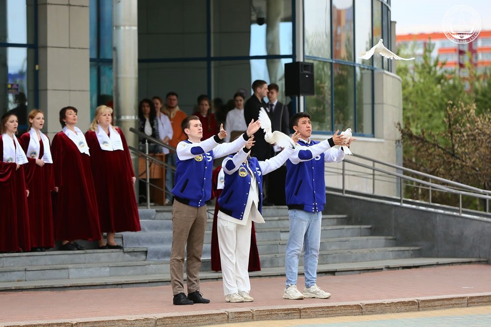 В завершение митинга участники выпустили в небо белых голубей и прошли вокруг Главного корпуса Сургутского госуниверситета и через Врата знаний в сопровождении флагов с буквами кириллицы, глаголицы и современного алфавита.