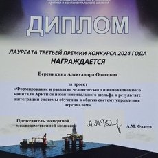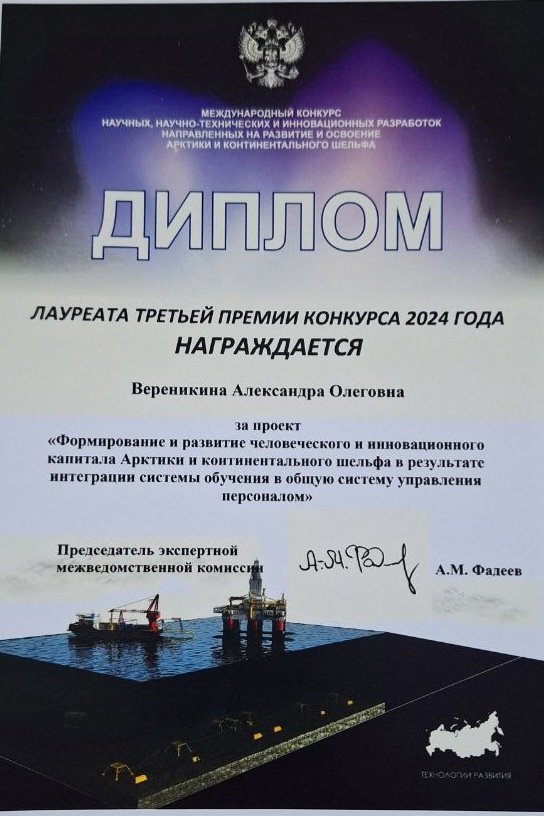 На Международном конкурсе научных, научно-технических и инновационных разработок, направленных на развитие и освоение Арктики и континентального шельфа, Александра Вереникина представила проект, посвященный формированию и развитию человеческого и инновационного капитала данной территории в результате интеграции системы обучения в общую систему управления персоналом. Награждение победителей прошло в рамках Международной выставки и конференции по судостроению и разработке высокотехнологичного оборудования для освоения Арктики в Санкт-Петербурге.