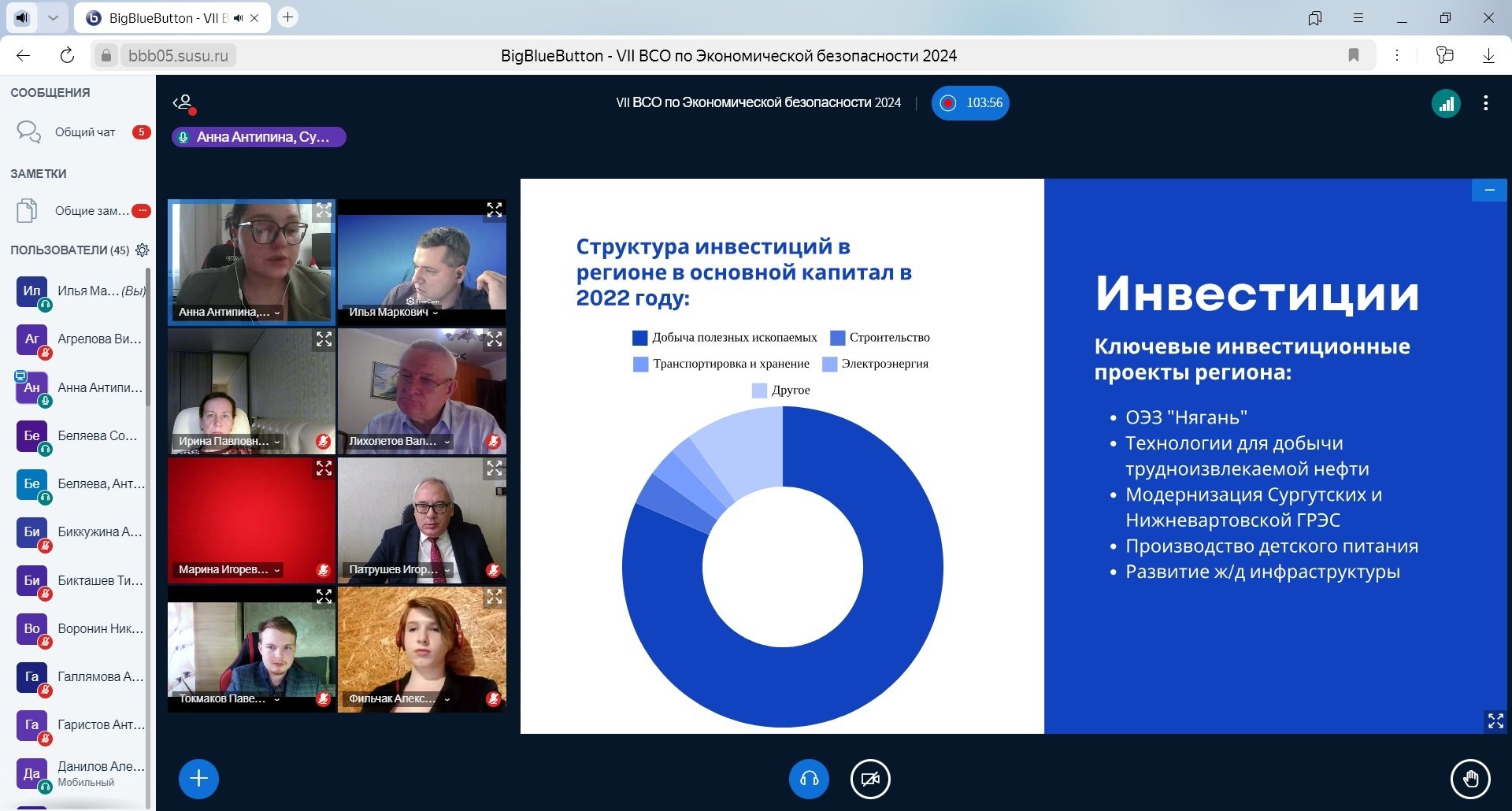 В соревновании приняло участие 29 команд (89 студентов) из 29 вузов России. Олимпиада включала три этапа. Первый этап – индивидуальное онлайн-тестирование участников; второй – решение кейс-задания по расчету и оценке экономической безопасности компании; третий, заключительный, этап олимпиады – выступление участников с заранее подготовленными научными докладами. Доклад команды СурГУ был посвящен прогнозу кадрового обеспечения реализации инвестиционных проектов в Ханты-Мансийском автономном округе – Югре. Ребята проанализировали текущее состояние рынка труда региона и спрогнозировали потребность в кадрах для реализации запланированных инвестиционных проектов до 2027 года.