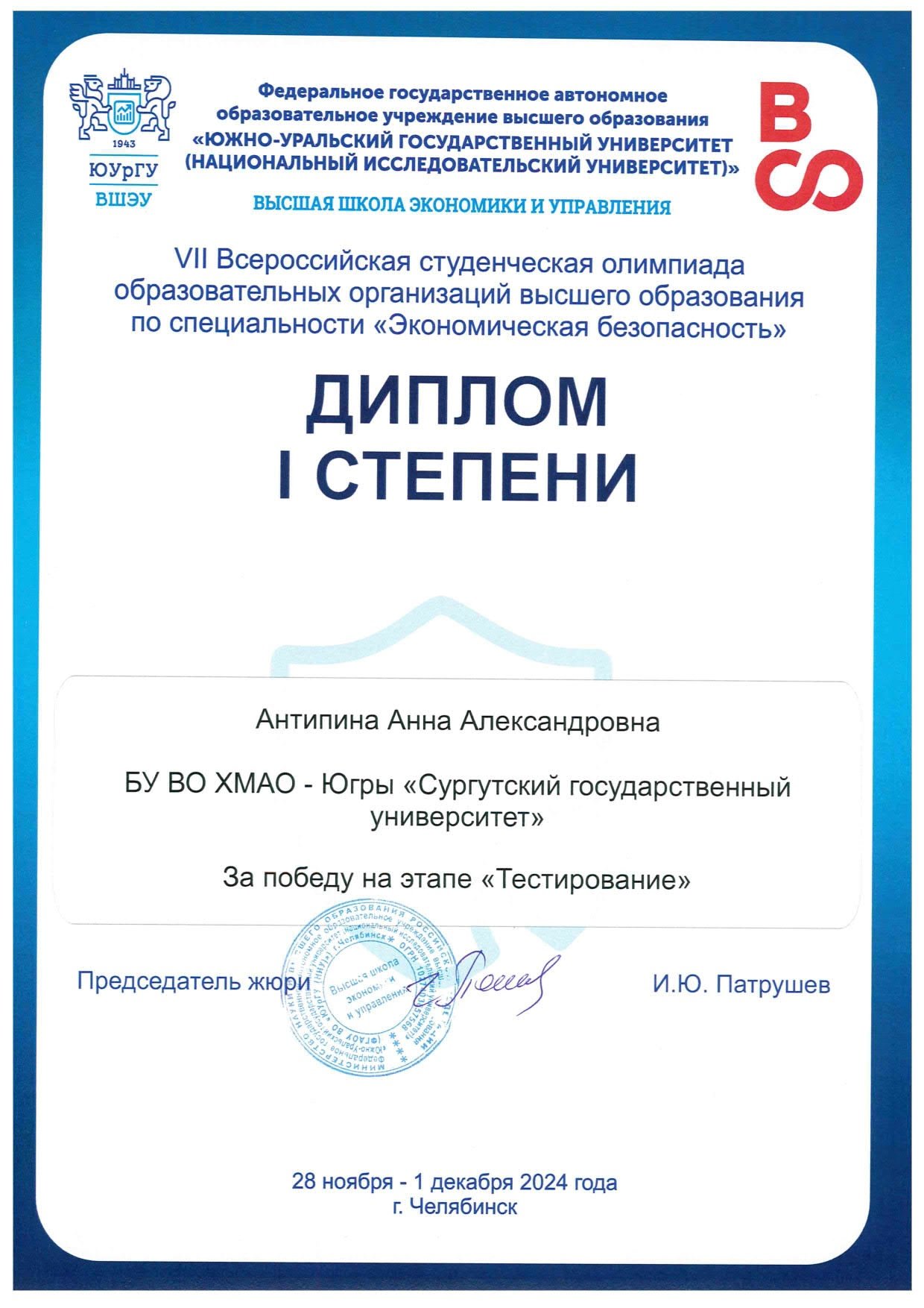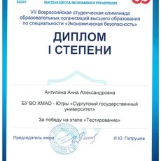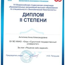 Студентка Института экономики и управления Сургутского госуниверситета – победитель и призер VII Всероссийской студенческой олимпиады образовательных организаций высшего образования по специальности «Экономическая безопасность», которая проводилась на площадке Высшей школы экономики и управления Южно-Уральского государственного университета.