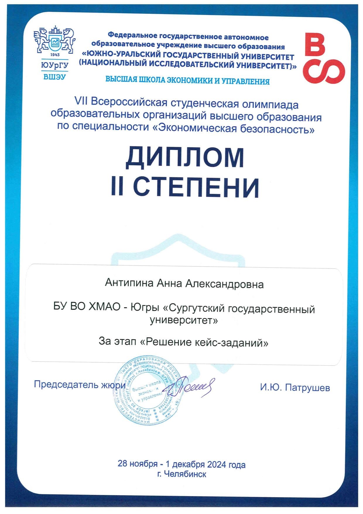«Участие в VII Всероссийской студенческой олимпиаде по экономической безопасности стало для меня ценным опытом. Достигнутые результаты – первое место в этапе тестирования, второе место в решении кейс-заданий и третье место в личном зачете по итогам всех этапов – свидетельствуют об эффективности подготовки и владении теоретическими знаниями и практическими навыками в области экономической безопасности. Высокий уровень сложности заданий и конкуренции участников позволили оценить глубину собственных знаний и выявить перспективы для дальнейшего профессионального развития. Благодарю организаторов олимпиады за высокий уровень проведения мероприятия и предоставленную возможность участия. Выражаю признательность своему научному руководителю – Наталье Васильевне Тимофеевой за неоценимую помощь и поддержку», – прокомментировала Анна Антипина.