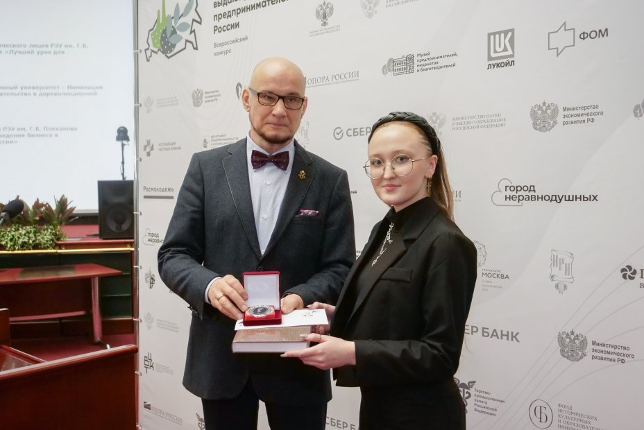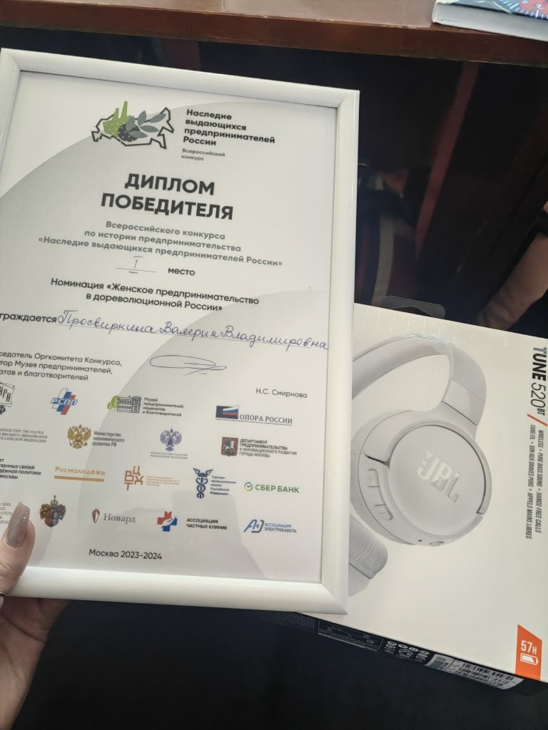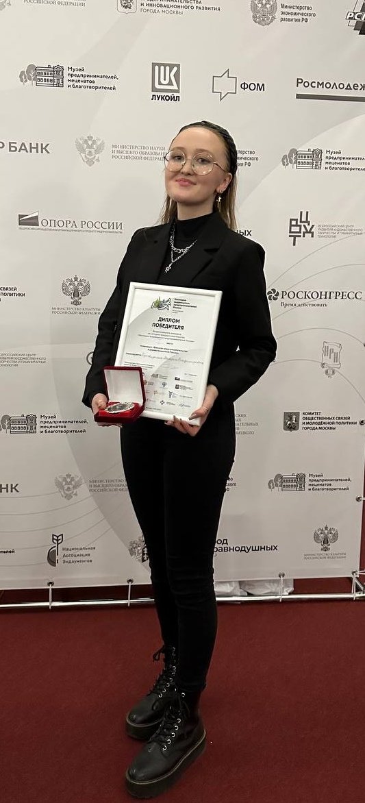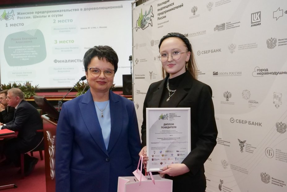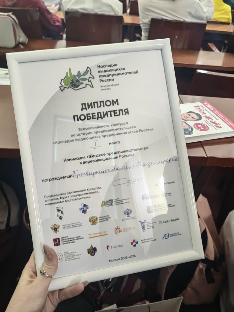 • в номинации «Женское предпринимательство в дореволюционной России»: 1-е место   у магистранта и преподавателя СПО (г. Ноябрьск) Валерии Просвиркиной. Валерия Владимировна удостоена медали А. И. Абрикосова по решению потомка этой династии;