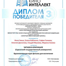 На церемонии закрытия Международного кинофестиваля учебных фильмов и инновационного образовательного контента «КиноИнтеллект», которая состоялась 17 мая 2024 года г. Москве в Белом зале Государственного геологического музея РАН, проект «ЧИТАЕМ В ОРИГИНАЛЕ» («Разрисованная вуаль» У.С. Моэма, «The Painted Veil») победил в номинации 3 степени «Вдохновляющая идея фильма для воспитания и профессиональной ориентации».