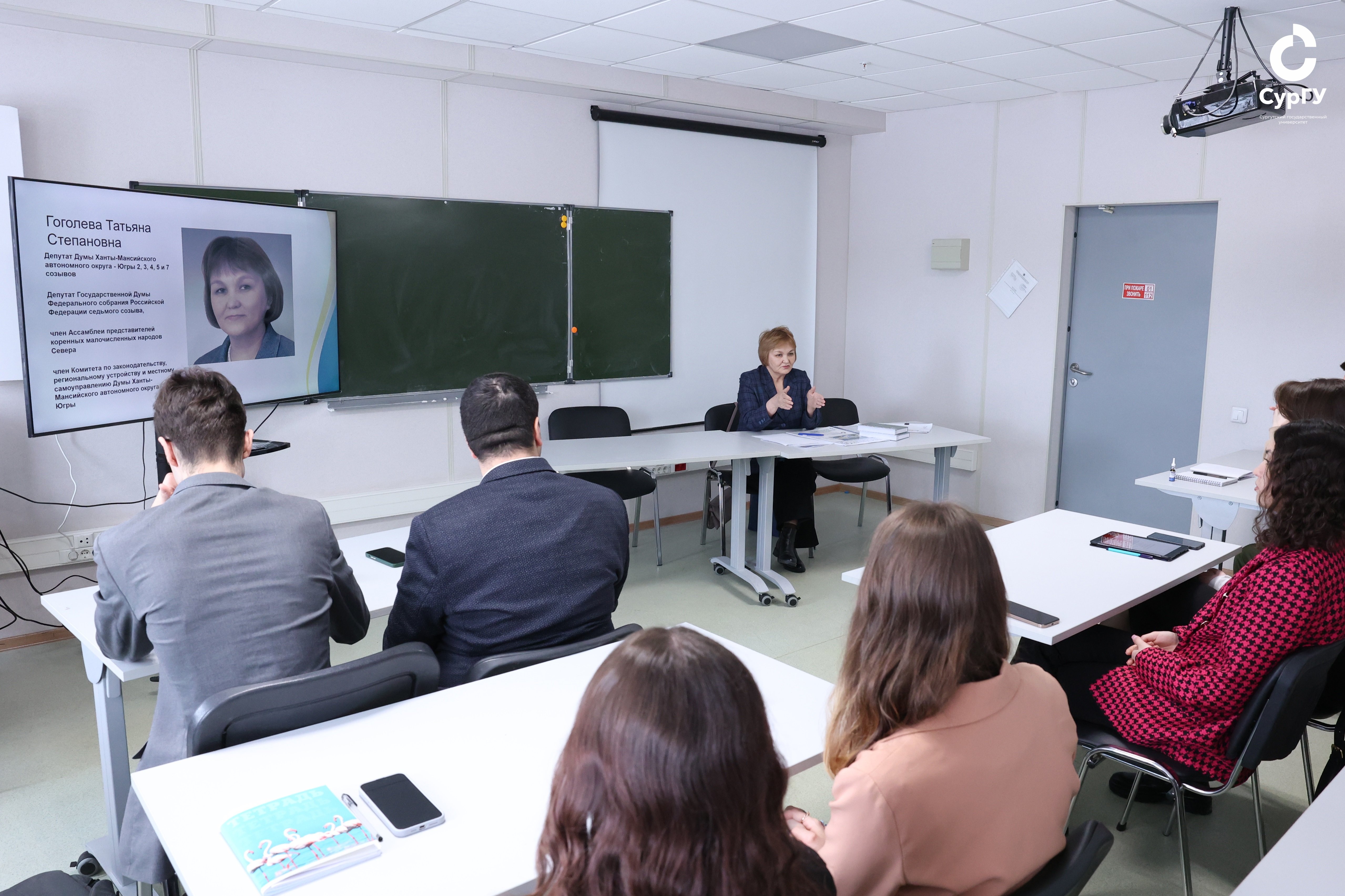 Депутат Думы Ханты-Мансийского автономного округа – Югры VII созыва, член Ассамблеи представителей коренных малочисленных народов Севера, член Комитета по законодательству, региональному устройству и местному самоуправлению Татьяна Гоголева провела рабочую встречу с молодыми юристами Института государства и права Сургутского госуниверситета.