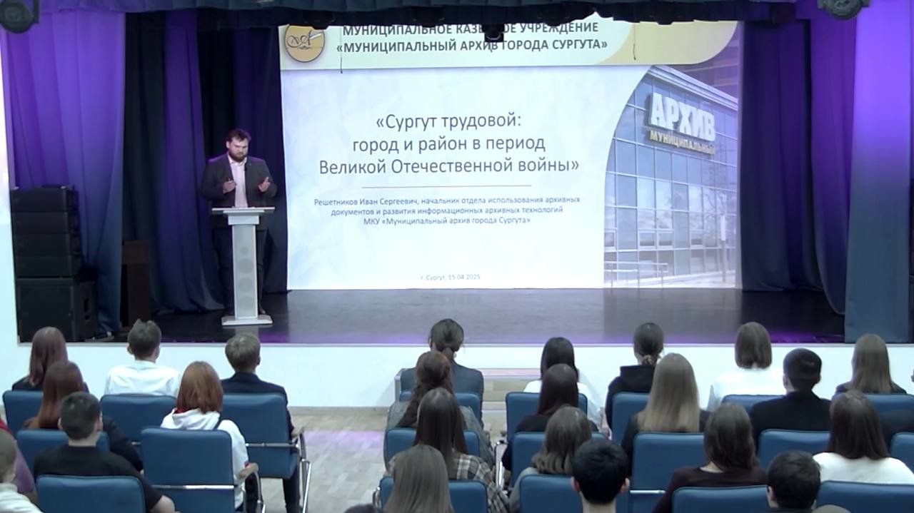 Программа события включала два блока. В первой части участники погрузились в историю: лекции экспертов рассказали о вкладе Сургута и инженерной мысли в общую Победу. Иван Решетников, выпускник СурГУ и ведущий археограф Муниципального архива города Сургута, представил доклад «Сургут трудовой: город и район в период Великой Отечественной войны». Он рассказал, как тогда еще село Сургут стало важным тыловым центром: здесь нарастили производство рыбы, а эвакуация Одесской рыбоконсервной фабрики позволила еще эффективнее снабжать фронт продовольствием. Из Сургута и Сургутского района на войну ушли 2615 человек.