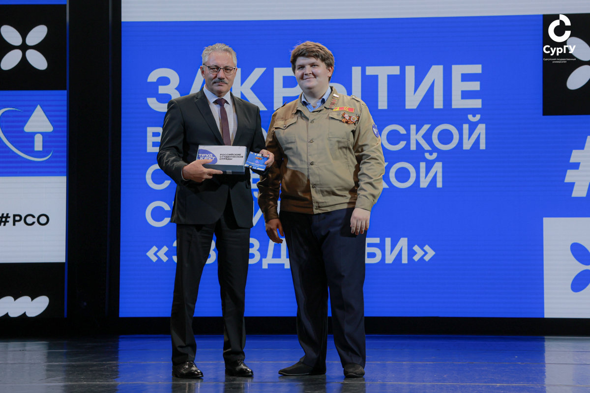 Командир стройотряда СурГУ «Монолит» Юрий Ерченко был награжден благодарственным письмом за высокие результаты работы и активное участие в реализации проекта «Звезда Оби». Кроме этого, ректору СурГУ Сергею Косенку и заместителю гендиректора АО «Мостострой-11» Сергею Сметанюку были вручены памятные флаги стройки «Звезда Оби». Церемония награждения сопровождалась творческими номерами от Сургутской филармонии и студенческих стройотрядов.